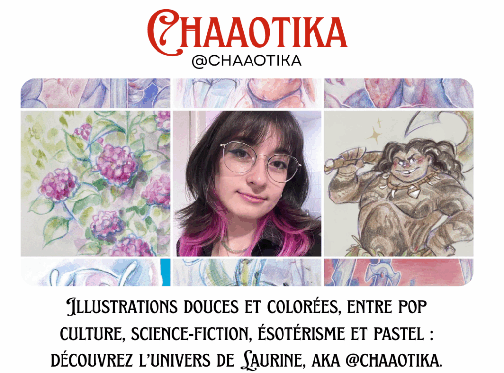 Laurine, aka @chaaotika sur les réseaux, est une illustratrice autodidacte basée à Lyon. Elle travaille principalement au dessin traditionnel à l’aquarelle, dans un univers doux et coloré ! La pop culture, les couleurs pastel et la science-fiction sont ses principales sources d’inspiration !